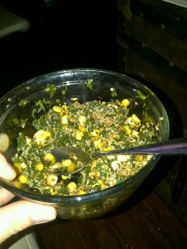 All you need is half a cup of quinoa, package of frozen chopped spinach and a cup of frozen corn. Bring the quinoa to a boil with one cup of water. Once boiling reduce to low heat and cover for 15 minutes.